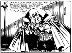 Invece di salvare i deboli e combattere i potenti, Superciuk fa l’esatto contrario. Ruba ai poveri per dare ai ricchi, gira con un fiasco sempre a portata di mano e usa come arma una micidiale fiatata alcolica. Una caricatura perfetta del supereroe classico, ma anche uno dei momenti più riusciti della satira di Max Bunker.